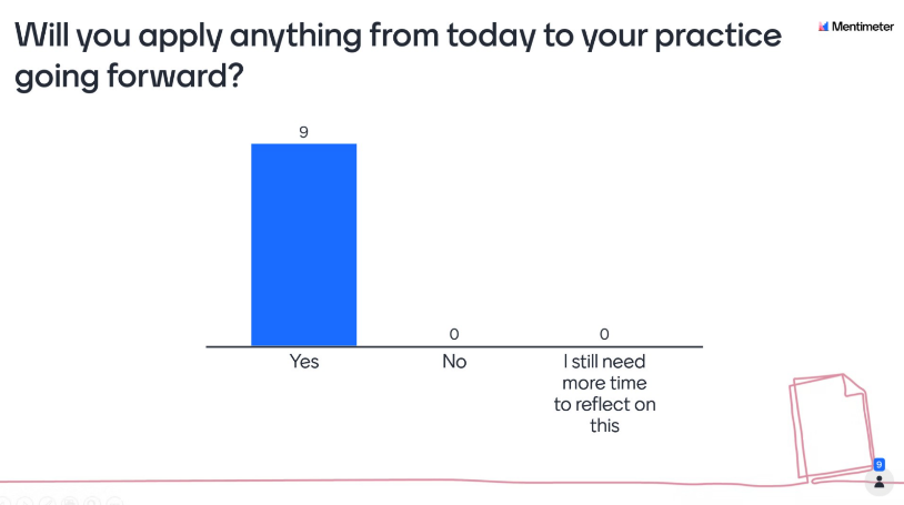 At the close of the session we asked everyone to reflect on the training. Practitioners overwhelmingly told us that they had gained something from the training that they would take forward into their practice. In particular, a lot of attendees highlighted how valuable it had been to cover ways in which you can safely challenge perpetrator’s behavior. Attendees also said that break out rooms offered an opportunity to learn from each other, and see the creative and adaptable ways in which other practitioners were dealing with challenging situations.