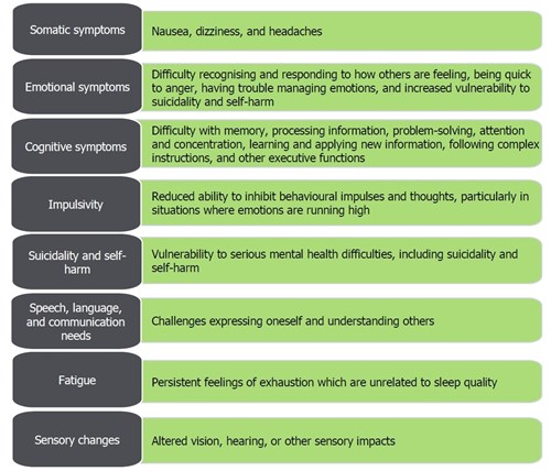 - UNDERSTAND Staff should have a sufficient understanding of the key symptoms that usually present as a result of brain injury.